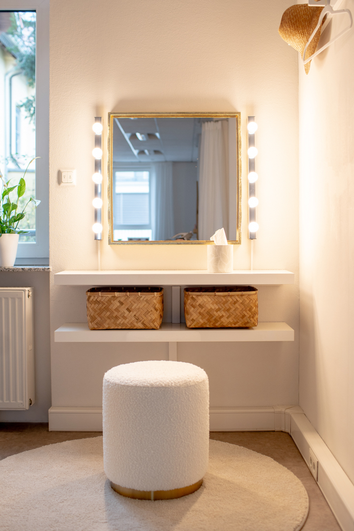 In der Schminkecke kannst du dich vor dem Shooting in Ruhe fertig machen. Haarsträhnen richten, Make-up auffrischen, oder einfach einen Moment tief durchatmen – du startest vorbereitet und entspannt in die Session.