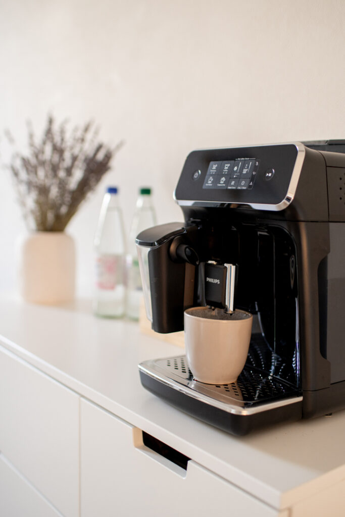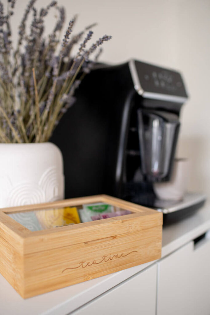 Ein gemütlicher Platz zum Ankommen und Entspannen – mit Sofa und einer kleinen Kaffee- & Teebar. Hier könnt ihr vor, während oder nach dem Shooting chillen und euch wie zuhause fühlen.