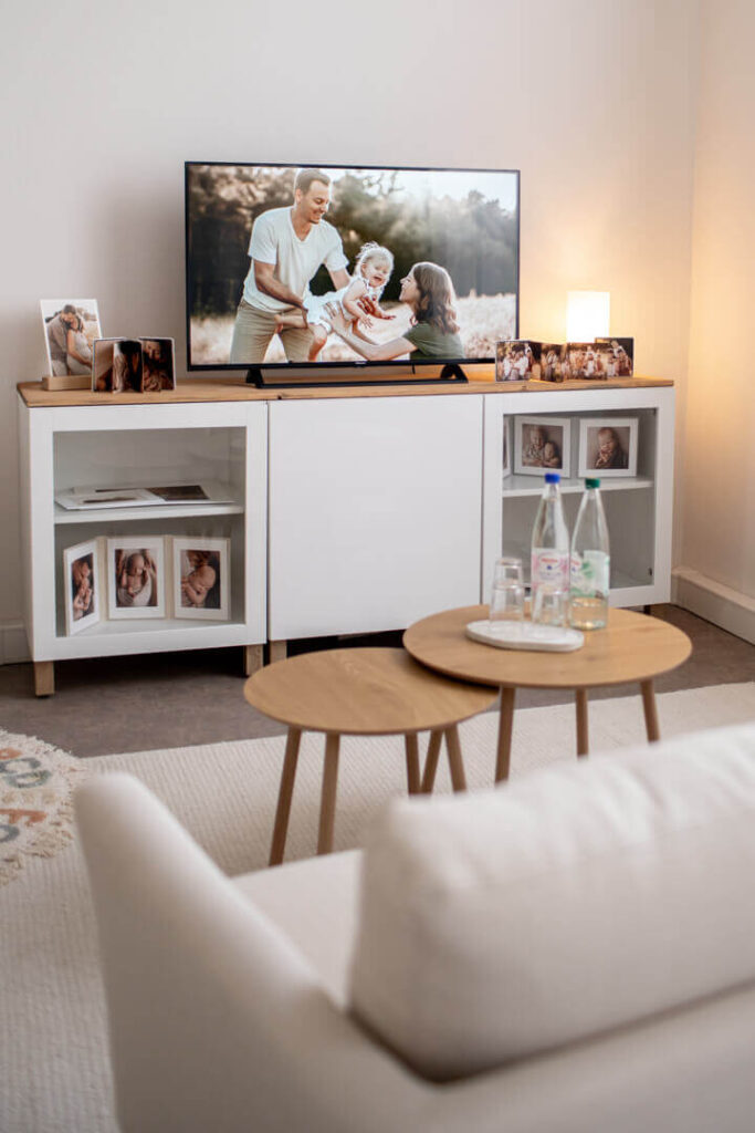 Nach dem Shooting wartet hier ein besonderes Highlight auf euch: Eine musikhinterlegte Slideshow auf großem Bildschirm – fast wie im kleinen Kino und genau so, wie es eure Erinnerungen verdienen: groß, emotional und in aller Ruhe. Viele Familien sagen, dass sie dieser Augenblick richtig berührt hat.
